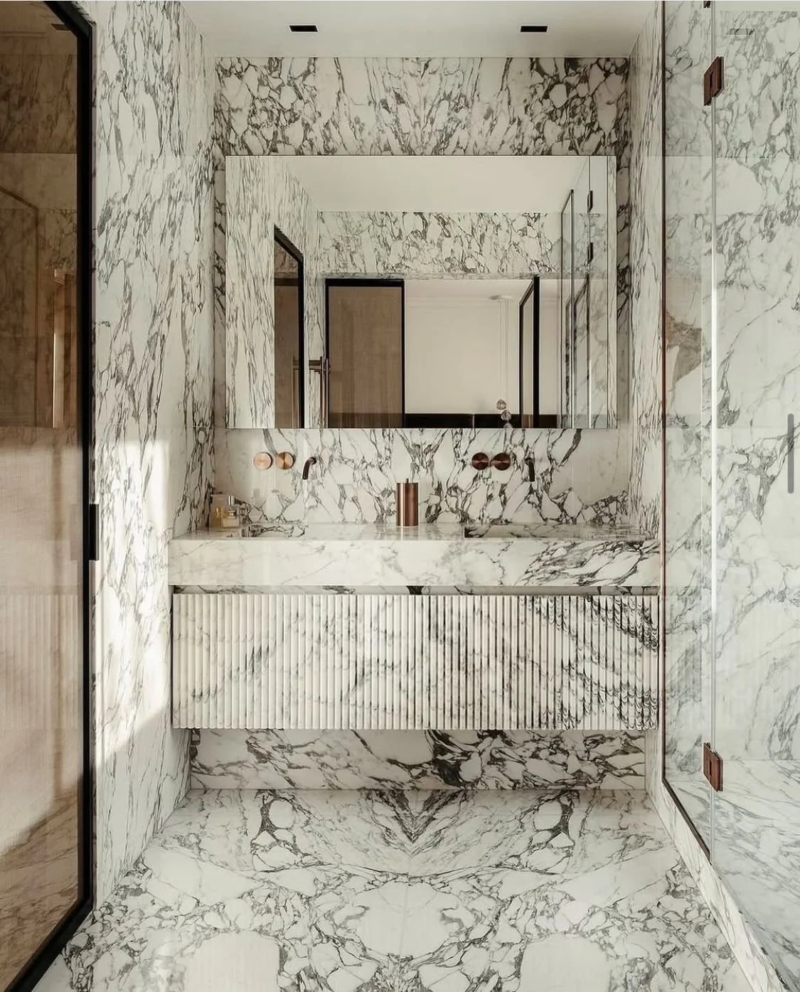 Ez a gondolkodásmód rokonságban áll a korábbi color drenching trenddel, ahol egyetlen szín uralja a teret. Itt viszont az anyag válik a kompozíció alapjává. A márvány, travertin vagy éppen a kvarzit meghatározza a tér struktúráját, atmoszféráját.